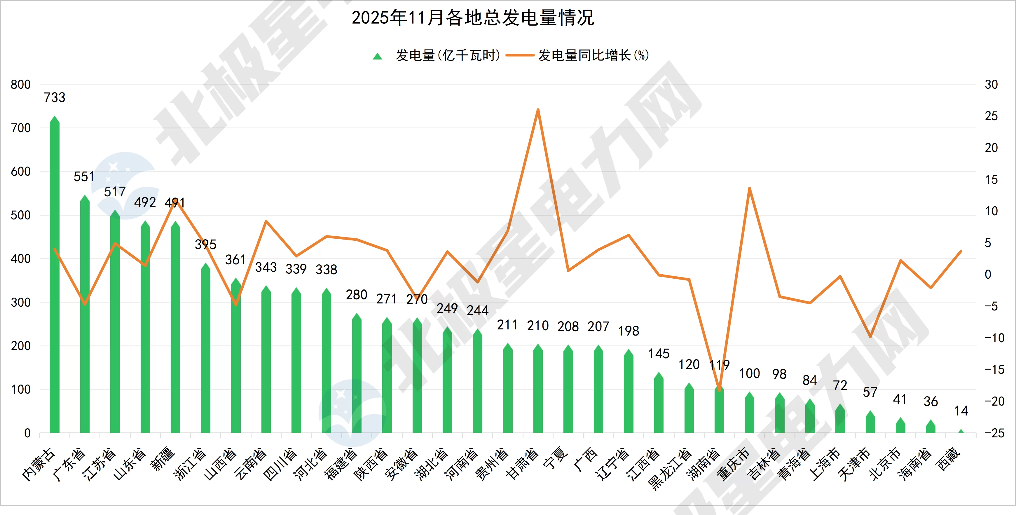 2025年11月份,全国规上工业发电量7792亿千瓦时,同比增长2.7%;日均发电量259.7亿千瓦时。分品种看,11月份,规上工业火电由增转降,水电较快增长,核电、太阳能发电增速加快,风电由降转增。其中,规上工业火电同比下降4.2%,10月份为增长7.3%;规上工业水电增长17.1%,增速比10月份放缓11.1个百分点;规上工业核电增长4.7%,增速比10月份加快0.5个百分点;规上工业风电增长
